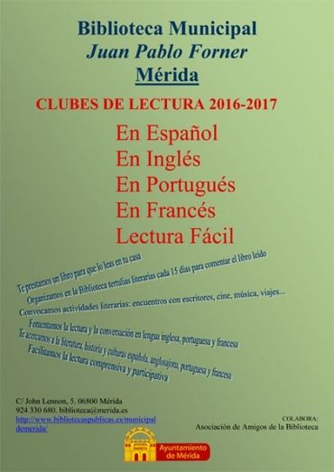 Las personas interesadas en participar en el Club de Lectura (en cualquiera de las modalidades), leer en casa, acudir a las tertulias en la biblioteca, asistir a encuentros con escritores, viajes literarios, presentaciones de libros o representaciones de teatro, ésta es la actividad cultural que buscan y pueden informarse en la Biblioteca Municipal Juan Pablo Forner situada en la calle John Lennon, 5 de Mérida.