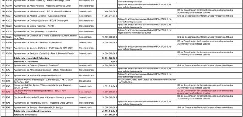 El BOE con fecha 3 de octubre recoge la aprobación de una ayuda de 5.000.000 euros para la zona de Montijo-Puebla de la Calzada y municipios limítrofes tras aprobarse el proyecto Edusi-AUF Montijo-Puebla de la Calzada, de Diputación Provincial, una estrategia de desarrollo urbano sostenible para la comarca que engloba como área urbana funcional además de Montijo y Puebla, Lobón, Valdelacalzada, Torremayor, Guadajira, Barbaño y Lácara.