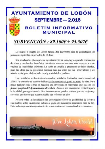 El Boletín informativo del Ayuntamiento de Lobón informa sobre una subvención de 89.100 + 95.507 euros destinadas a la anualidad 2016/2017 de contratación de mano de obra de jornaleros agrícolas en periodos de 15 días, cuyos proyectos necesitan una inversión en materiales con fondos propios del Ayuntamiento de Lobón. Informa el Ayuntamiento que “aún así son inversiones rentables para la localidad, pues gestionando bien los recursos se pueden realizar grandes mejoras y servicios que hacen que nuestro pueblo sea referente en ello”.
