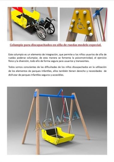 Estas instalaciones deportivas y de ocio, cuentan con un columpio para discapacitados en silla de ruedas, un elemento de integración que permite a los usuarios en silla de rueda poder disfrutar como el resto de niños de los columpios.