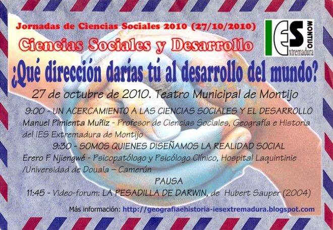 La charla empezará con una introducción acerca de la situación actual y perspectivas académicas y laborales de las Ciencias Sociales, y el tratamiento que se hace del desarrollo desde las distintas Ciencias Sociales a cargo del profesor de Geografía e Historia del IES Extremadura Manuel Pimienta Muñiz.
