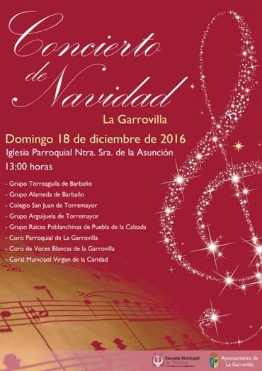 DOMINGO 18 DE DICIEMBRE FESTIVAL NAVIDEÑO Un año más y con la llegado de estas fechas se celebra en la localidad el popular CONCIERTO NAVIDEÑO que transmitirá la verdadera esencia que se puede vivir en estos días. Dicho festival estará protagonizado por diferentes grupos de la comarca y grupos locales como el Coro de Voces Blancas de la Escuela Municipal de Música, la Coral Municipal Virgen de la Caridad y el Coro Parroquial Nuestra Señora de la Asunción. Lugar: Iglesia Parroquial Nuestra Señora de la Asunción Horario: En horario de mañana después de misa. Entrada: Libre.