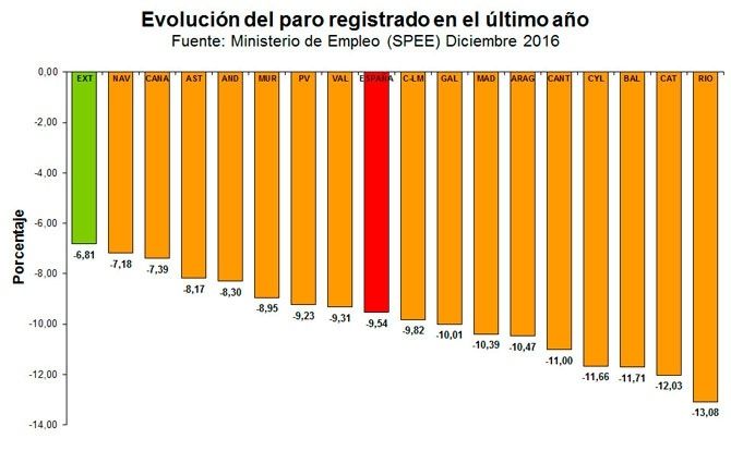 El Grupo Parlamentario Popular (GPP) ha criticado las políticas del gobierno de la Junta que han situado a Extremadura a la cola en los índices de evolución del paro registrado y la afiliación media publicados hoy por el Ministerio de Empleo. La portavoz de Empleo del GPP, Mª Ángeles Muñoz, ha afirmado que los datos del mes de diciembre reflejan que se están destruyendo empresas, autónomos y empleo del sector privado.
