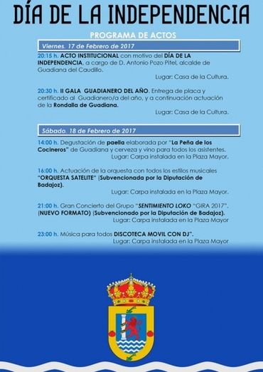 Hoy viernes 17 de febrero se celebra en Guadiana del Caudillo el 7º Día de la Independencia, con un Acto Institucional a cargo del alcalde de la localidad, Antonio Pozo Pitel, en la Casa de la Cultura, a lo que seguirá la II Gala Guadianero del Año.