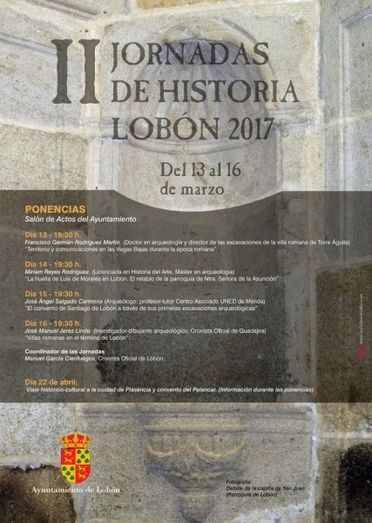 Del 13 al 16 de marzo el Ayuntamiento organiza las II Jornadas de Historia, coordinadas por Manuel García Cienfuegos, Cronista Oficial de Lobón. Las ponencias se celebrarán durante esos días en el salón de actos del Ayuntamiento a las 19:30h.