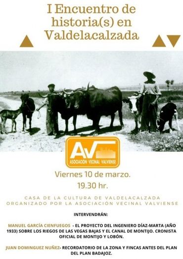 Esta tarde, a las 19:30 horas, tendrá lugar en la Casa de la Cultura la celebración del “I Encuentro de historia(s) en Valdelacalzada”. La jornada contará con la presencia del historiador y Cronista Oficial de Montijo y Lobón, Manuel García Cienfuegos y de Juan Domínguez Núñez, vecino de Guadiana del Caudillo y autodidacta en el conocimiento de la comarca y su historia.