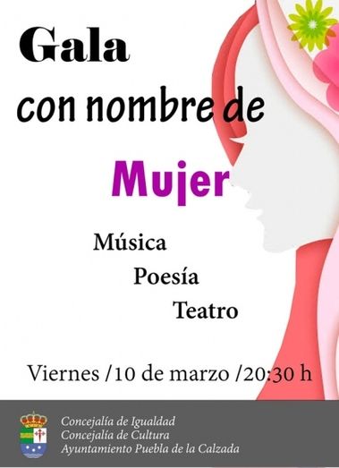 Esta tarde, a las 20:30 horas, en la Casa de la Cultura de Puebla de la Calzada, dentro de la programación con motivo del Día Internacional de la Mujer, la Concejalía de Igualdad, por segundo año consecutivo, ha organizado el espectáculo musical: “Con nombre de Mujer”, en el que participarán una selección de mujeres artistas de nuestra comarca, las cuales mostrarán sobre el escenario sus dotes en el mundo de la música, el teatro y la poesía.