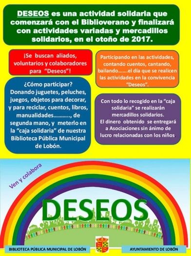 Además, se está organizando "Deseos", una actividad solidaria que comenzará con el Biblioverano de Lobón y finalizará con actividades variadas y mercadillos solidarios, en el otoño de 2017.