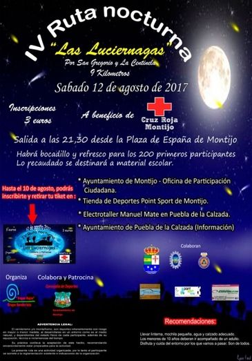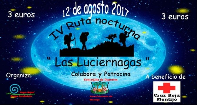 El Grupo Senderista Vegas Bajas organiza, en colaboración con la Concejalía de Deportes del Ayuntamiento de Montijo, la IV Ruta Nocturna “Las Luciérnagas”, una ruta de 9 kilómetros de dificultad baja que transcurre por San Gregorio y la Centinela. La salida será el 12 de agosto a las 21:30 horas desde la Plaza de España de Montijo y habrá bocadillo y refresco para los primeros 200 inscritos.