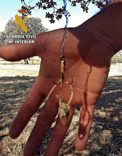En dos de las fincas inspeccionadas, se hallaron colocados en varios puntos estratégicos, DIEZ poteras (Anzuelos) de las utilizadas para la pesca, colgadas mediante alambre desde varias encinas a un metro de altura y con sardinas a modo de cebo.