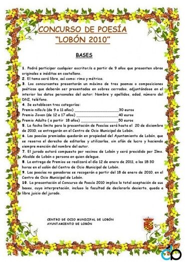 5. La fecha límite para la presentación de Poesías será hasta el 20 de diciembre de 2010, se entregarán en el Centro de Ocio Municipal de Lobón.