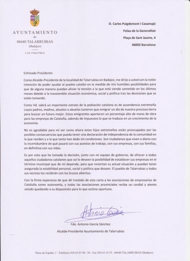 El Alcalde de Talarrubias, Antonio García Sánchez, ha remitido una carta dirigida a Carles Puigdemont, Presidente de la Generalitat de Cataluña, en la que ofrece “con la noble intención de poder ayudar al pueblo catalán en la medida de mis humildes posibilidades para que de alguna manera puedan aliviar la tensión a la que está siendo sometido en los últimos meses debido a la insostenible situación económica, social y política tras las decisiones que se están tomando”.