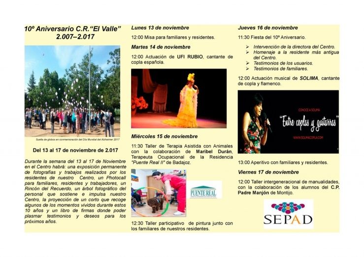 El Centro Residencial “El Valle”, en la localidad de Montijo, celebra del 13 al 17 de noviembre, su 10º Aniversario con una serie de actos que ponen en valor su carácter pionero, al ser el primer centro público de la región dedicado a la atención de las demencias degenerativas primarias (Alzheimer y otras demencias).