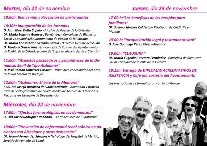 La Casa de la Cultura acogerá del martes 21 al jueves 23 de noviembre las ‘VII Jornadas sobre Alzheimer y otras demencias de Puebla de la Calzada’.