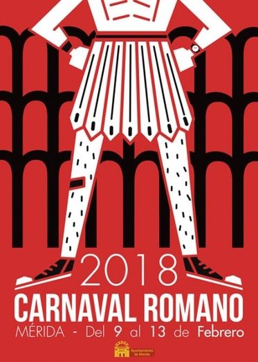 Destaca en el cartel una imagen de una figura silueteada vestida de romano sobre el fondo del Acueducto de los Milagros con alto contraste entre rojo, negro y blanco “y unas zapatillas de deporte que destaca el carácter lúdico del Carnaval”.