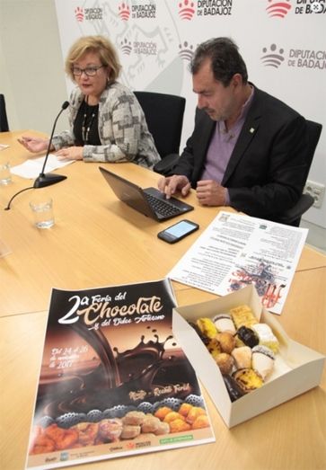 Mª Rosario Moreno, concejala del Ayuntamiento de Montijo y diputada provincial del OAR y Alfonso Barroso, concejal de Comercio, han presentado en la Diputación de Badajoz, la 2ª Feria del Chocolate y Dulce Artesano, junto con el Mercado Medieval, que se va a desarrollar del 24 al 26 de noviembre.