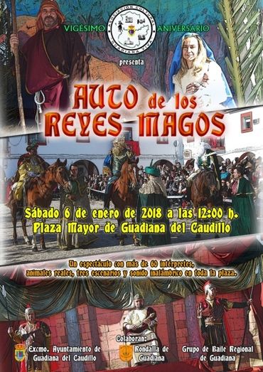 La Asociación Cultural “Guadiana Viva”, que celebra este próximo año su vigésimo aniversario, vuelve a representar en Guadiana del Caudillo el “Auto de los Reyes Magos”, un espectáculo con más de 60 intérpretes que se celebrará en tres escenarios repartidos en distintos puntos de la localidad. El espectáculo cuenta, además, con animales reales y sonido inalámbrico para dar una ambientación más real a la historia que se cuenta: la adoración de los Reyes Magos.