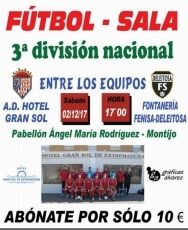 El sábado, 2 de diciembre, a las 17:00 horas, la A.D. Hotel Gran Sol F.S. se enfrenta al Fontanería Fenisa-Deleitosa, en el Pabellón Ángel María Rodríguez de Montijo.