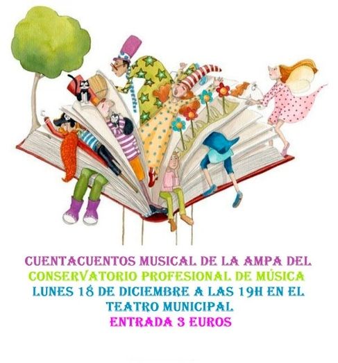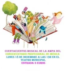 El lunes, 18 de diciembre, el AMPA del Conserevatorio ofrecerá un Cuentacuentos para los más pequeños, en el Teatro Municipal, a las 19:00 horas. El coste de la entrada es de 3€.