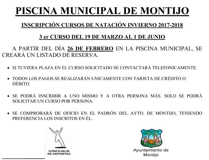 El 19 de marzo se inicia el tercer curso de natación de invierno en la Piscina Municipal de Montijo, que finalizará el 1 de junio.