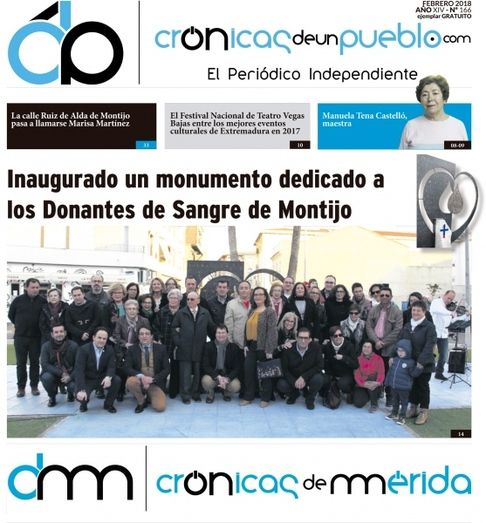 El número 166 de Crónicas de un Pueblo lleva en su portada el monumento que el Ayuntamiento de Montijo encargó a Vicente Gragera para rendir homenaje a los donantes de sangre de Montijo y que se inauguró el sábado 24 de febrero, coincidiendo con la gala de entrega de distinciones a los donantes de Montijo, Barbaño y Lácara.