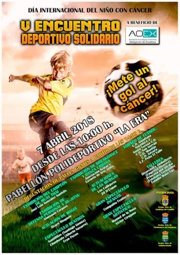 Con motivo del  Día Internacional del Niño con Cáncer, la Delegación de Guadiana del Caudillo de la Asociación Oncológica Extremeña (AOEX) junto al  el Ayuntamiento de Guadiana del Caudillo, con el Ayuntamiento de Pueblo Nuevo  y el Ayuntamiento de Valdelacalzada se va a llevar a cabo el V Encuentro Deportivo Solidario a  beneficio de la Delegación de Guadiana del Caudillo de la  Asociación Oncológica Extremeña, con el lema METE UN GOL AL CANCER. Se celebrará el día 7 de Abril del presente año en el Pabellón Polideportivo “La Era” de Guadiana del Caudillo a partir de las 10:00 de la mañana hasta las 22:00 h con el objetivo de facilitar la participación de los niños oncológicos en actividades deportivas y de ocio y para recaudar fondos para la propia delegación, para dar servicios a pacientes con cáncer  y sus familias.