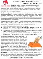 En la nota repartida en forma de octavillas por IU se señala que “no olvidamos aquella promesa electoral del PSOE de junio de 2015: ‘Nuestro compromiso es no subir los impuestos y tasas; durante estos cuatro años el PP ha subido los impuestos mi entiendo en su programa y engañando porque EL PROGRAMA ES UN CONTRATO Y DEBE SER CUMPLIDO”. ¡Prometer hasta meter!
