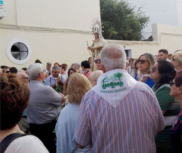 Tras la llegada al llamado ‘lugar de costumbre’ fue saludada por el párroco de San Pedro Apóstol, Pedro Gómez Serrano; en nombre de la Hermandad lo hizo Manuel García Cienfuegos. Tres montijanas le cantaron una nueva canción a la Virgen de Barbaño, Feli Chávez, autora de la composición, Juany Flecha y Cati Zambrano.