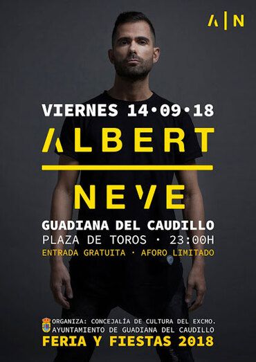 La actuación de Albert Neve tendrá lugar en la Plaza de Toros instalada durante las fiestas en Guadiana del Caudillo, el viernes 14 de septiembre a partir de las 23:00 horas. La entrada será gratuita hasta completar el aforo limitado.