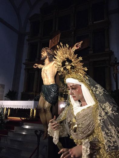Las imágenes titulares representaban un momento bíblico nunca antes visto en Montijo, pues ambas fueron colocadas en el altar mayor de la parroquia representando el Monte Calvario con la madre a los pies de la cruz. Al término de la eucaristía y como colofón final del acto los cofrades y asistentes participaron en un solemne besapié al Santísimo Cristo de la Agonía y un solemne besamanos a María Santísima de los Dolores.