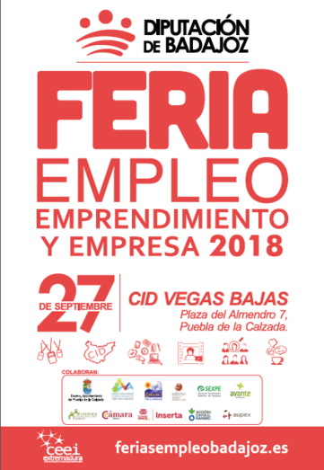 La Feria de Empleo, Emprendimiento y Empresa 2018, se celebrará en el CID Vegas Bajas (Plaza del Almendro, 7, Puebla de la Calzada) el próximo día 27 de septiembre.