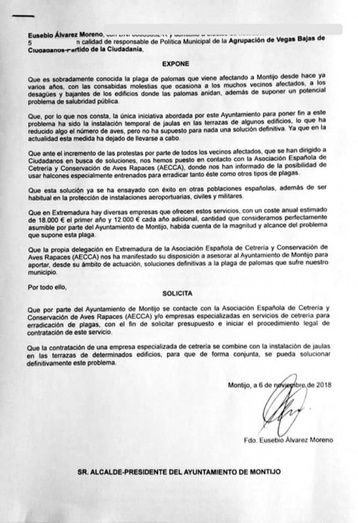 La Agrupación afirma haberse puesto en contacto con la delegación en Extremadura de AECCA, quienes les habrían manifestado su disposición a asesorar al Ayuntamiento “para aportar, desde su ámbito de actuación, soluciones definitivas a la plaga de palomas que sufre nuestro municipio”, por lo que la agrupación naranja solicita que el Ayuntamiento contacte con ellos “para solicitar un presupuesto e iniciar una contratación y que la contratación se combine con la instalación de jaulas en las terrazas de determinados edificios, para que de forma conjunta, se pueda solucionar definitivamente este problema”.