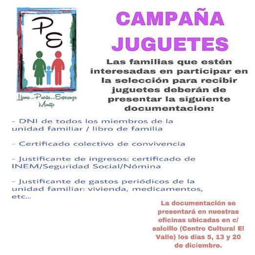 Las familias que estén interesadas en participar en la selección para recibir juguetes deberán presentar la siguiente documentación en las oficinas de la Asociación (Centro Cultural El Valle, en C/ Salcillo) los días 5, 13 y 20 de diciembre: