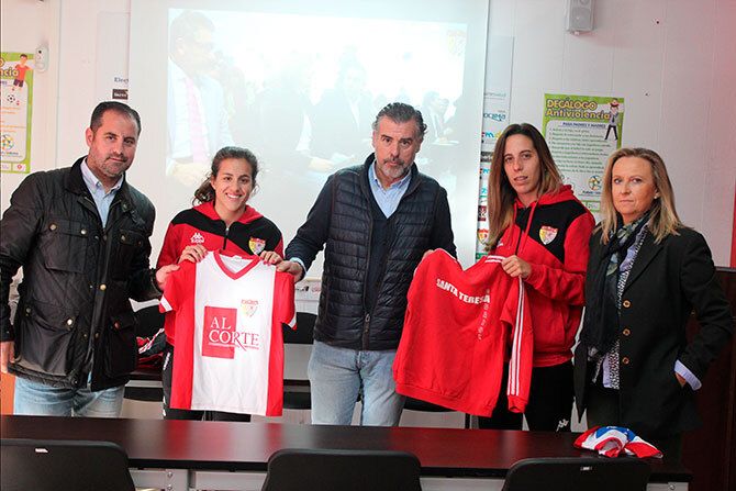 María Jesús Vega, presidenta del club Santa Teresa Badajoz, junto al vicepresidente, Pablo Ritoré y las jugadoras del primer equipo del Liberbank Santa Teresa Badajoz, capitaneadas por Estefanía Lima y María Neira, han hecho entrega del material a D. Javier Solanas, presidente de la Fundación Esportus.