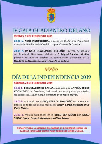 Estos comenzarán el viernes 15 de febrero con un acto institucional a cargo de D. Antonio Pozo Pitel en la Casa de la Cultura, a las 20:30 h. A continuación, tendrá lugar la IV Gala Guadianero del Año, distinción que se otorgará este año a D. Miguel Sánchez Murillo, párroco de la localidad. La noche finalizará con la actuación de la Rondalla de Guadiana.