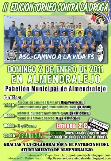 La Asociación Camino a la Vida, a través de su equipo de fútbol sala, ha organizado la II Edición del Torneo Contra la Droga, en Almendralejo. La primera edición, en la que se consiguió la victoria, fue en Montijo.