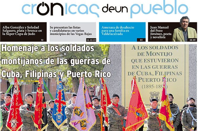 La portada del número 179 de Crónicas de un pueblo | El Periódico Independiente trae como foto principal el homenaje a los soldados montijanos de la guerra de Cuba, Puerto Rico y Filipinas.