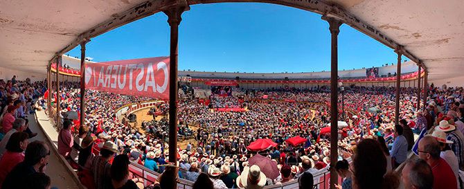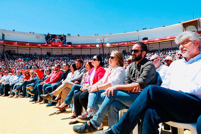 El acto del PSOE en Mérida, con Vara, Osuna y Sánchez, llena la Plaza de Toros