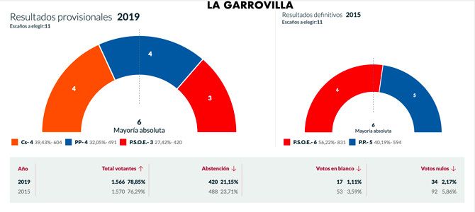 También llamativo el resultado en La Garrovilla. Ciudadanos es la fuerza más votada, obteniendo 4 concejales. También con 4 concejales, pero menor porcentaje de votos, se encuentra el PP. El PSOE, que gobernaba la localidad hasta ahora, se queda con 3 concejales de los 6 que tenía en 2015.
