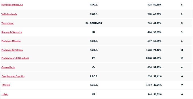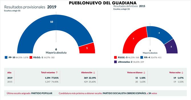 En Pueblonuevo del Guadiana los datos han sido claros: el PP obtiene 10 concejales de 11 posibles. El PSOE, que en las últimas elecciones habían ganado en número de votos y conseguido 5 concejales, sin poder gobernar al realizarse un pacto entre PP y Extremeños, se queda en estos comicios con 1 sólo representante.