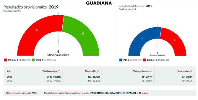 En Guadiana del Caudillo se produce un vuelco electoral. El vencedor de los comicios será el PSOE en esta ocasión, que obtiene 6 concejales frente a 5 que consigue VOX. El PP, que presentó candidatura en la localidad, no obtiene representación.