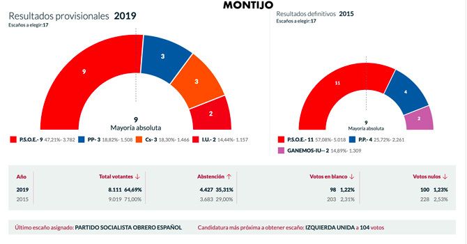 En Montijo el PSOE obtiene mayoría de nuevo y volverá a gobernar durante una nueva legislatura, aunque pierde dos concejales. El PP de nuevo es la segunda fuerza política en la localidad, aunque también baja su representación y obtiene 3 concejales. Ciudadanos sigue muy de cerca de los populares. Su primera candidatura en Montijo consigue 3 concejales, justamente los que parecen haber perdido PSOE y PP. Izquierda Unida, en cambio, que se presentaba sin coalición, mantiene a sus dos concejales en el Ayuntamiento de Montijo.