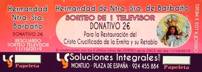 Se sorteará un televisor en combinación con las 3 últimas cifras del sorteo de la ONCE del 11 de octubre de 2019. Las papeletas se pueden adquirir en distintos establecimientos comerciales de la zona por un precio de 2€.