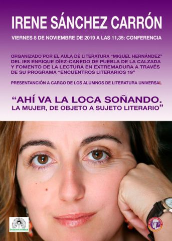 El ‘Aula de Literatura Miguel Hernández’ del IES Enrique Díez-Canedo inicia su actividad un curso más. Es la octava edición. El viernes 8 de noviembre a las 11:35 Irene Sánchez Carrón visitará el instituto de Puebla de la Calzada para abordar el tema de ‘La mujer de objeto a sujeto literario’ en su conferencia ‘Ahí va la loca soñando’, destinada a los alumnos de Bachillerato. También leerá sus poemas y debatirá el el centro con los jóvenes sobre la creación literaria.