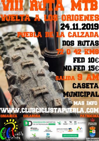 El domingo 24 de noviembre tendrá lugar la octava edición de la Ruta MTB "Vuelta a los orígenes", organizada por el Club Ciclista Puebla de la Calzada. Se trata de una prueba popular, pensada para que todos, sea cual sea el nivel, puedan enfrentarse a ella, tanto para correrla como para disfrutarla en grupo de forma sosegada