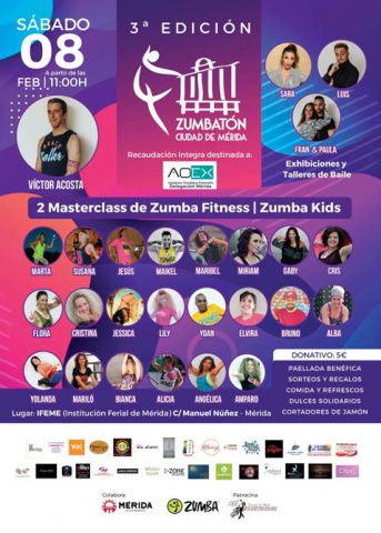 El responsable de la organización, Víctor Acosta, ha explicado que “es una actividad deportiva que se prolongará durante todo el día; habrá talleres, masterclass y exhibiciones de baile moderno y bailes latinos, todo ello dirigido por instructores debidamente acreditados, venidos incluso de otras localidades”. En el Zumbatón participarán hasta veinticinco instructores de zumba y casi medio centenar de empresas colaboradoras. La actividad comenzará a las 11 horas hasta las 20 horas, que es la hora prevista de cierre.