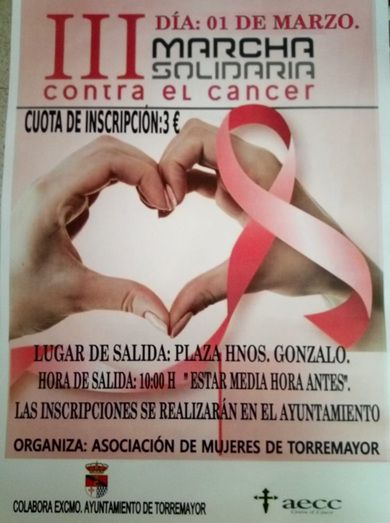 Por otro lado, el domingo 1 de marzo, se celebrará en Torremayor la III Marcha Solidaria Contra el Cáncer, organizada por la Asociación de Mujeres de Torremayor, a beneficio de la AECC. Las inscripciones (3€), se pueden hacer en el Ayuntamiento antes del día de la marcha, o antes de la marcha, en el lugar de salida, que será la Plaza Hermanos Gonzalo. La salida será a las 10:00 horas.