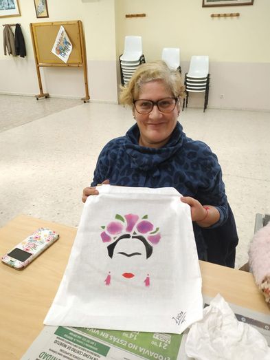 La actividad consiste en decorar bolsas de tela mediante la técnica del estampado. A cada mujer se le hará entrega de una bolsa de tela, que decorará a su gusto entre los dos modelos ofrecidos (logos: Frida Khalo y Rosie “la remachadora”). Con la ayuda de un pincel se escogerán los colores necesarios de pinturas de tela y posteriormente se estamparán en la bolsa, utilizando una plantilla de acetato de uno de los dos iconos de mujeres ofrecidos.
