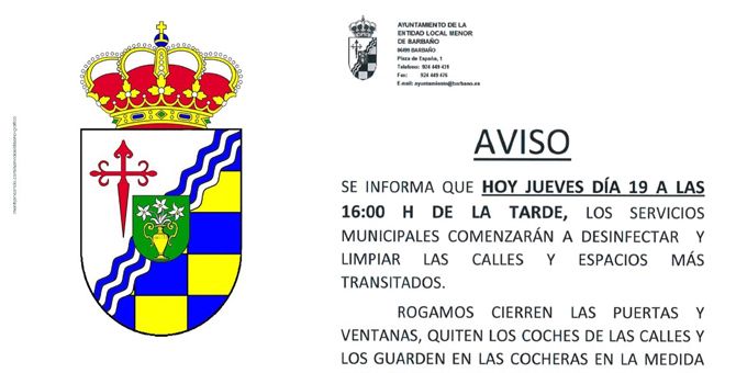 La tarea se iniciará a las 16:00 horas, por lo que ruegan a los vecinos que cieren puertas y ventanas, quiten sus vehículos de las calles si es posible para una mejor desinfección de las mismas.