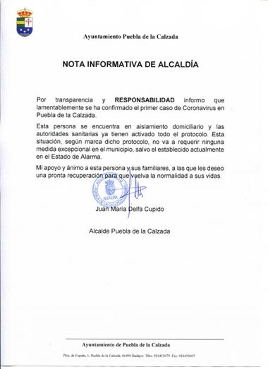 El alcalde de Puebla de la Calzada confirma en nota informativa el primer caso confirmado por Coronavirus en la localidad.